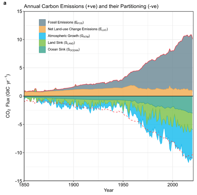We see that the contributions of biosphere and ocean to carbon uptake are of similar magnitudes and together they compensate around half of the carbon emissions caused by fossil fuel use and land-use change. The net land-use change emissions are the main factor we can directly influence, besides reduction of fossil fuel use, through reduction of deforestation and to a lesser extent afforestation, among others.