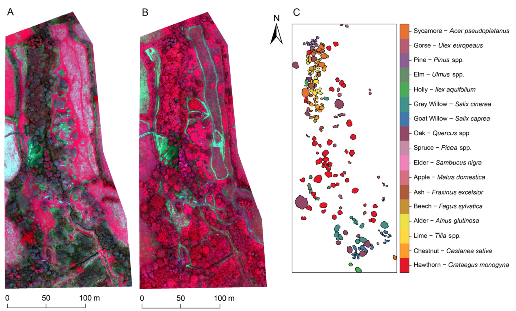 In this study we wanted to demonstrate how drones can be used to monitor and identify differences in the green-up of many different UK tree species. We focused on a woodland in Cornwall that was easily accessible for frequent revisits (Fig. 1). Besides monitoring the progression from leaf-off to full leafing out of individual trees, we were interested in the impact of sunny and overcast conditions on these observations. This is important when considering the practical applications of drone based monitoring, particularly in places where the weather is as diverse as in the UK.
