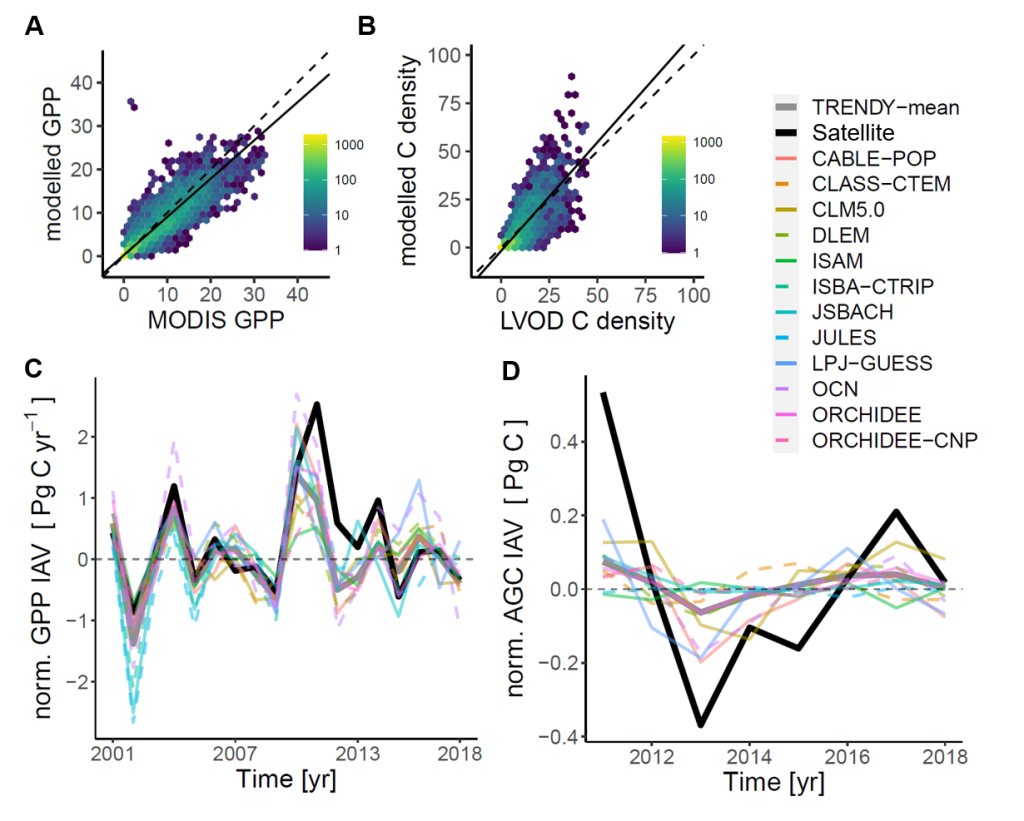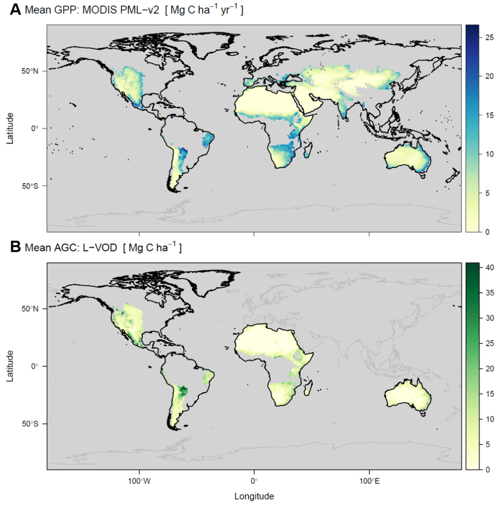 In this work, which was a close collaboration with dryland expert Andy Cunliffe, we set out to investigate some of the important LSM outputs for drylands by using satellite data based estimates as a comparison. We looked at gross primary productivity (GPP, amount of carbon captured by photosynthesis in a given period of time) and vegetation aboveground carbon stocks (AGC) (Fig. 1) as simulated by 12 state of the art LSMs and their spatial and temporal agreement with satellite estimates.