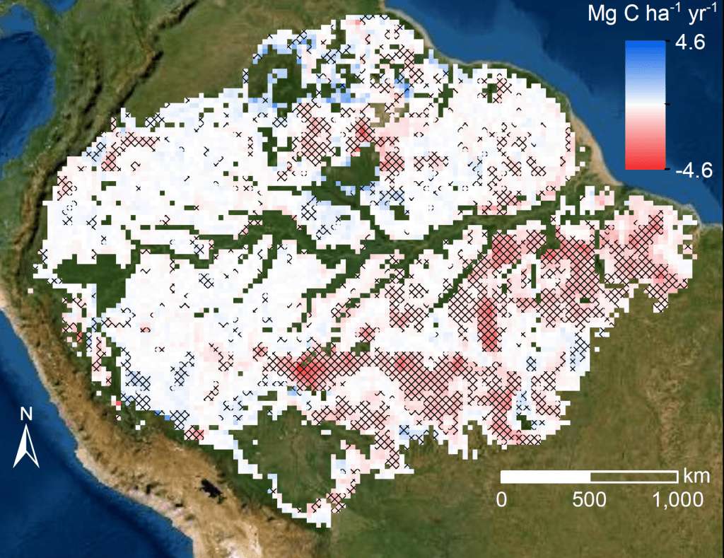 Fig. 1: Trends in aboveground biomass carbon (2011–2019) over the Amazon biome. Grid-cells where trends are significant are indicated with cross-hatches and cells where reliable data were not available are omitted (e.g. flooded areas and regional anomalies).
